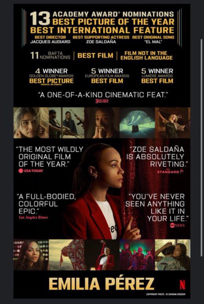 Netflix的《艾米莉亚·佩雷斯》颁奖季海报上只有佐伊·索尔达娜。